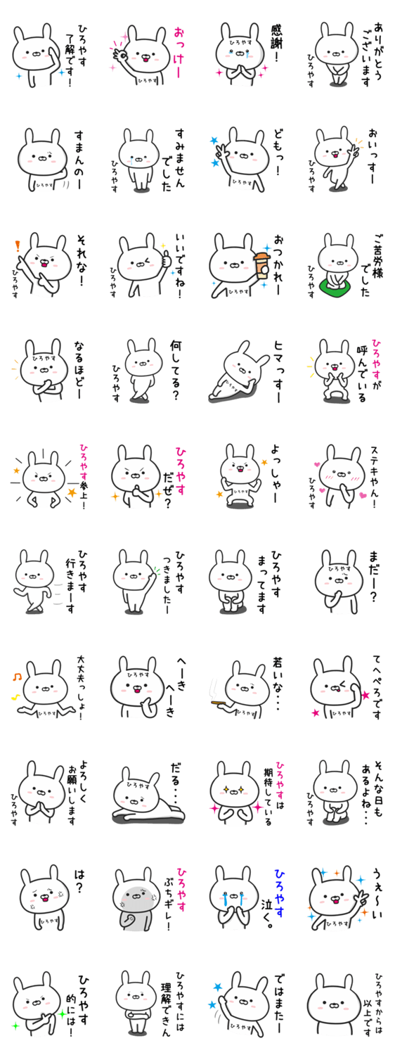 「ひろやす」さんが使える、ウサギの名前スタンプです。博康,裕康,宏保,弘養,浩康,広安,廣安,ヒロヤス,博恭,博泰,博裕,啓康,大康,宏康,宏恭,容康,宏裕,弘恭,裕泰,雄康など