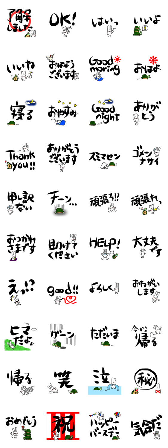 見やすいでか文字。毛筆風。うさぎとかめさんでチョット和風に。日常会話にどうぞ。