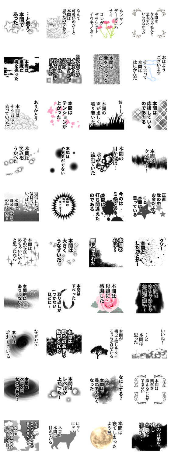 | スタンプ説明 | 苗字が本間(ほんま.ホンマ.さん等)名字が本間さんのためのナレーション名前スタンプです!モノローグがうけます! |