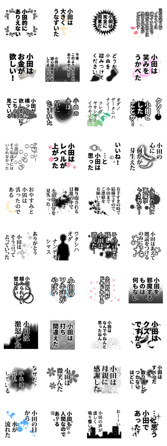 | スタンプ説明 | 苗字が小田(おだ.オダ.さん等)名字が小田さんのためのナレーション名前スタンプです!モノローグがうけます! |