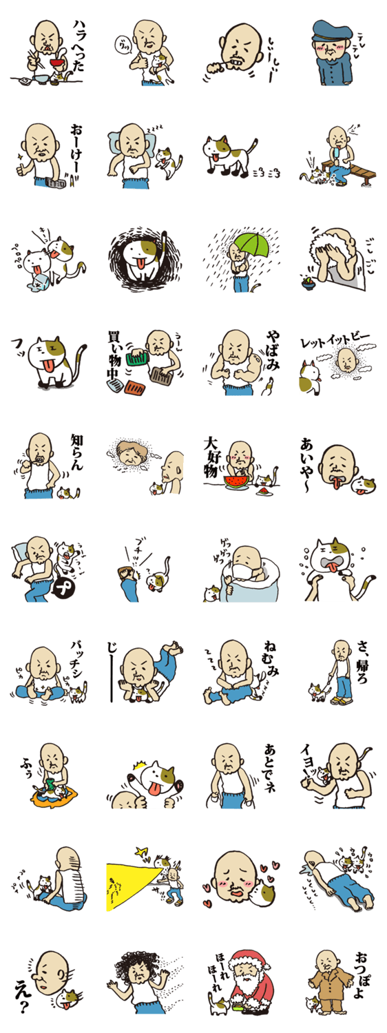いつもタンクトップのおじいさんと、かわいいネコのスタンプです。