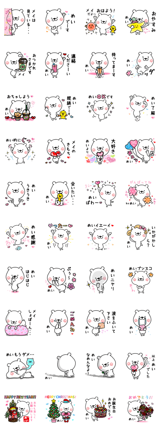 めい(めいこ/メイコ/めいか/めいさ/めいな/芽以/芽生/芽郁/芽衣/芽依/明依/明衣/明以/萌衣/愛依/恵/銘)ちゃん/くん専用白熊くまたお名前スタンプです。