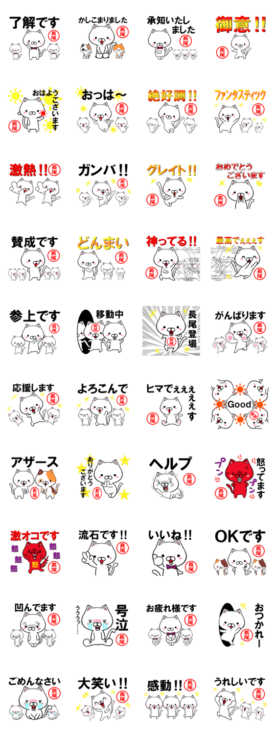 ねこのスタンプで、長尾(ながお・ナガオ・おがお・オガオ・おさお・オサオ)さん専用です。