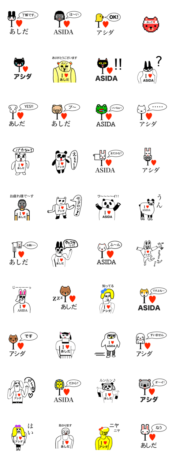 アシダ(あしだ・芦田・蘆田・足田・脚田・葦田)さんに送れる名前(名字・苗字)スタンプです。自分が大好きなあしださんにもオススメです。