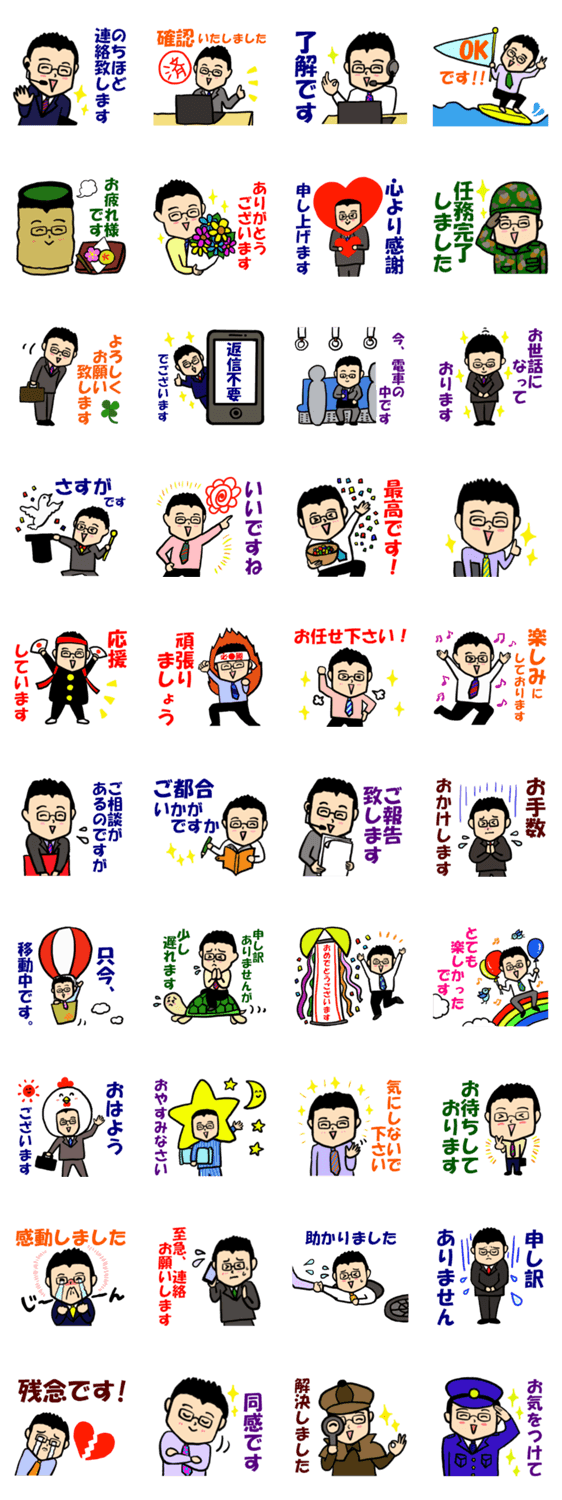 | スタンプ説明 | 短髪でメガネをかけた爽やかビジネスマン。7は仕事でよく使う言葉。きちんとした敬語丁寧語で感じよく、絵柄も楽しく便利に使えるように工夫しました。会社員、社会人に。 |