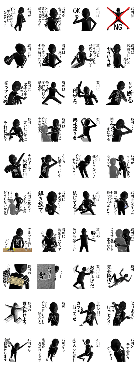 YOUって言っちゃう癖が強めのスタンプです。札/黒/白/ピンクの4パターンあり。石川・いかわ・イカワさん専用