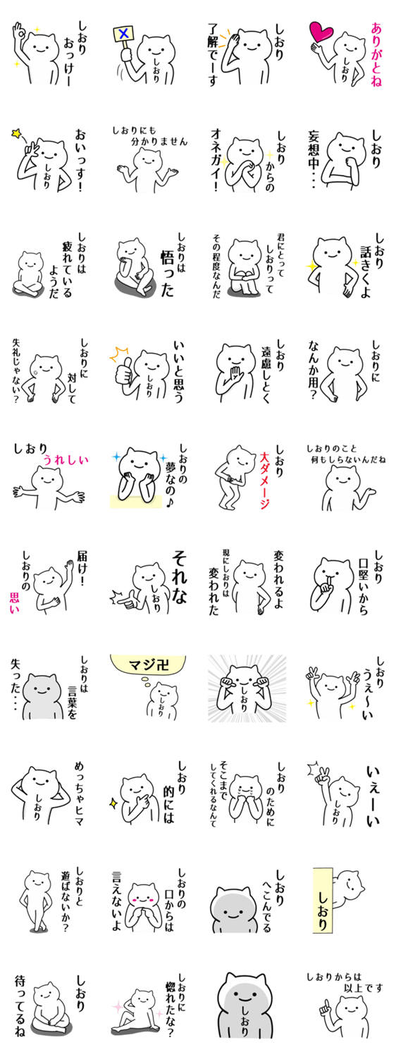「しおり」さんが使うネコの名前スタンプ。しおり,シオリ,詩織,栞,士織,史織,史緒里,汐里,志織,栞里,しお里,詩央里,志桜里,詩織里,汐莉,枝織,詩緒里。全てのしおりさん へ