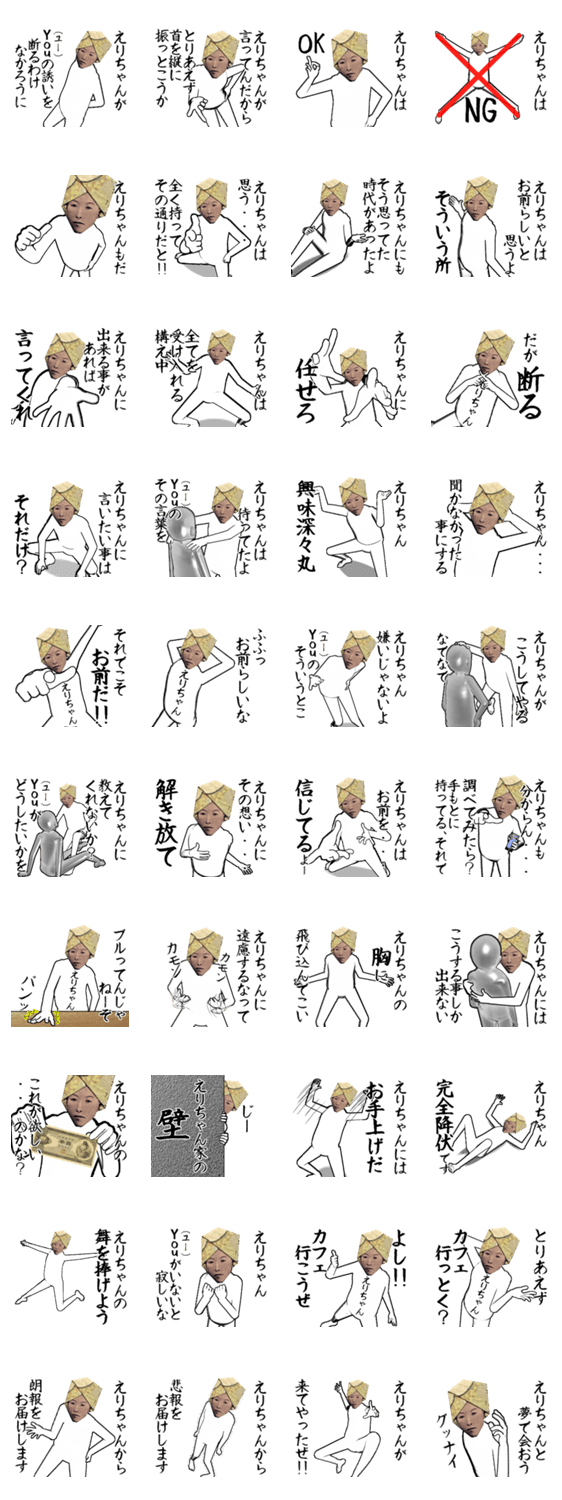 YOUって言っちゃう若干癖が強いスタンプです。エリ、えりな、えりか、絵里、愛莉、恵里、恵理、愛里、愛理、愛梨、絵梨、映里、英里、恵理子、絵里子、恵梨香ちゃん用