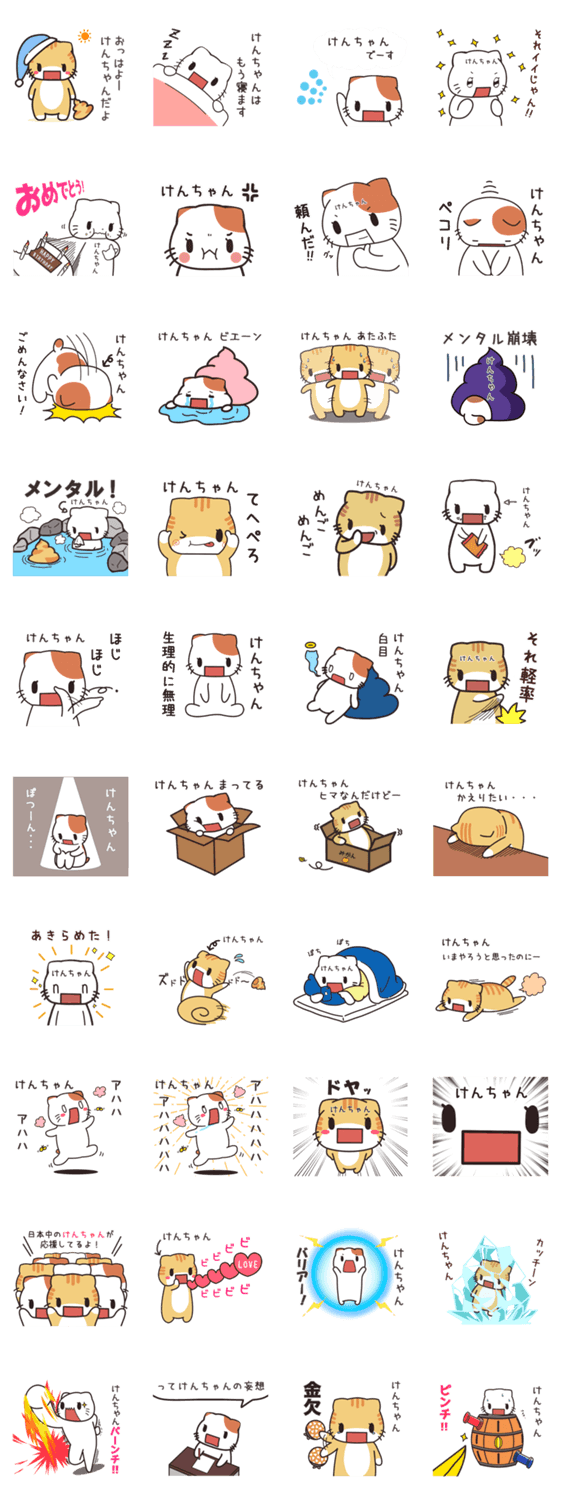 | スタンプ説明 | けんちゃんが使う貝ねこシリーズの名前スタンプ。けんた,けんいち,けんすけ,けんじ,けんさく,けんろく,けんじ,けんと,健太,健太郎,賢太,など全国のけんがつく人専用です。 |