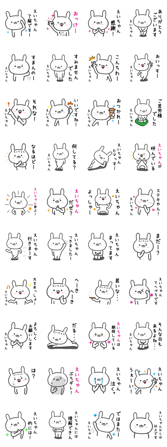 「えいちゃん」が使える、ウサギの名前スタンプです。日常会話で使いやすい基本セットです。えい、英、栄、エイ、永、映、衛、瑛、えいじ、えいた、えいきち、えいとなど。