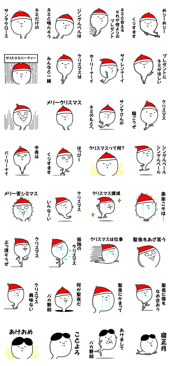 クリスマスに恋人がいる人もいない人も使えるゆるいスタンプ。正月用のスタンプも付いてるよ