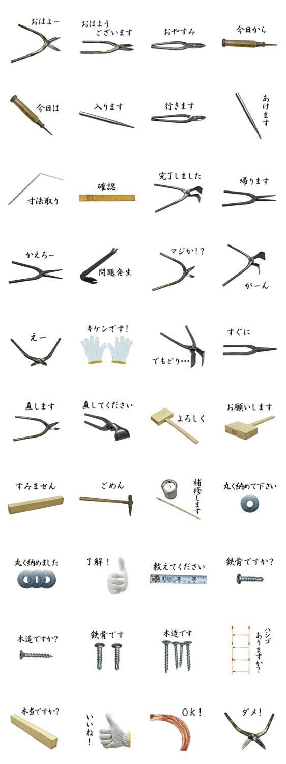 建築板金屋さんがよく使う道具とよく使う会話をコラボしました。トタン、ブリキ板を切ったり、曲げたり、叩いたり。ハサミやツカミ等の道具や工具の写真スタンプです。