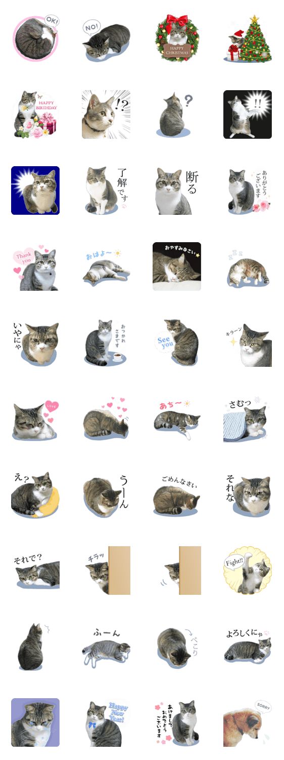 | スタンプ説明 | 猫好きさんへ捧ぐ… 本物の猫が可愛く気持ちを伝えます♪ 可愛いものからシュールなものなど色々! 季節のあいさつや敬語などつかいやすいものもあるよ! |