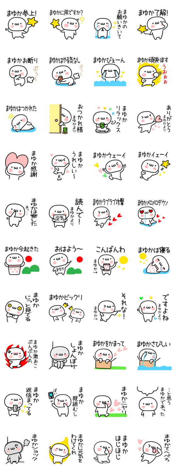 名前やあだ名に「マユカ」がつく方専用の名前スタンプです。しろくてまるいキャラクターです。