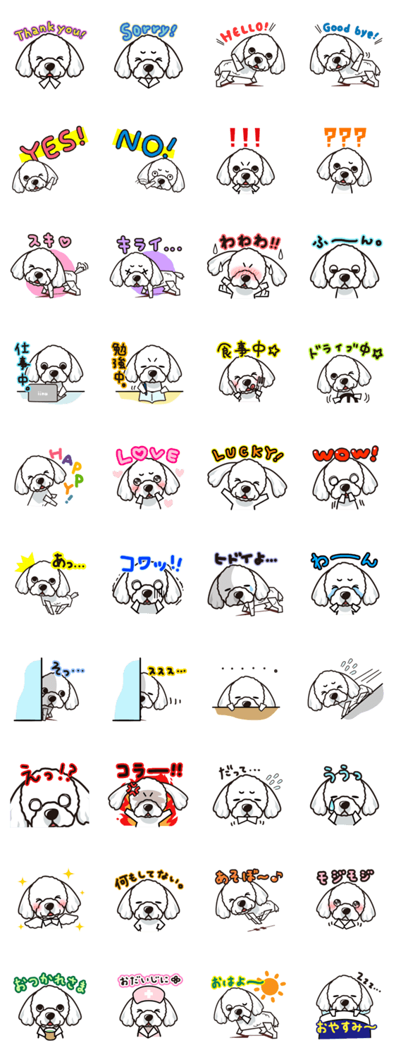 | スタンプ説明 | 「うちの子いるかな?」全130犬種のワンちゃんが、LINEスタンプに!表情豊かなスタンプでトークを楽しく盛り上げる♪iinu LINEスタンプ【マルチーズ】 |