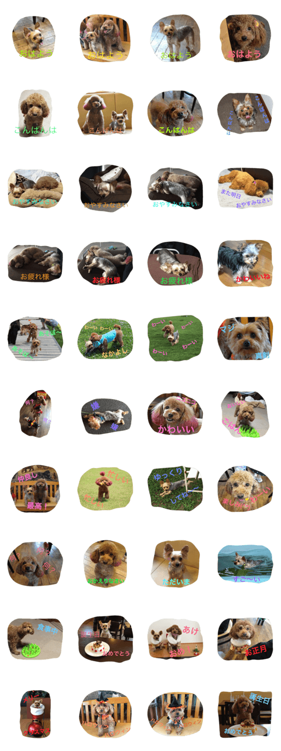 | スタンプ説明 | ヨーキーはなとトイプーこまち 3 我が家の愛犬、ヨークシャーテリアのはなちゃんとトイプードルのこまちちゃんです。とても元気でかわいい我が家のアイドルです。 |