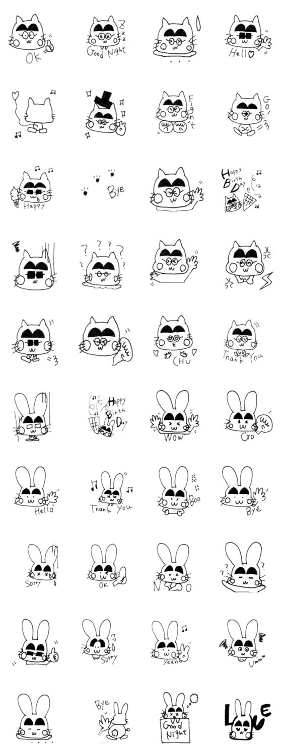 眉毛が特徴のかわいいうさぎさんとネコさんのスタンプ。手書き感がたまらない!!!