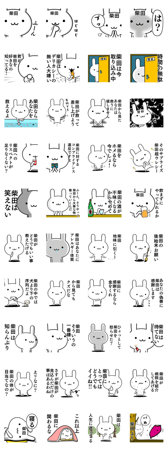 日本全国の苗字の中からしばたさんの為の無難な?毒舌うさぎスタンプ登場!便利で面白く,名字が柴田さんにずっと使える!家族,友達から愛するシバタさんへのプレゼントに♡