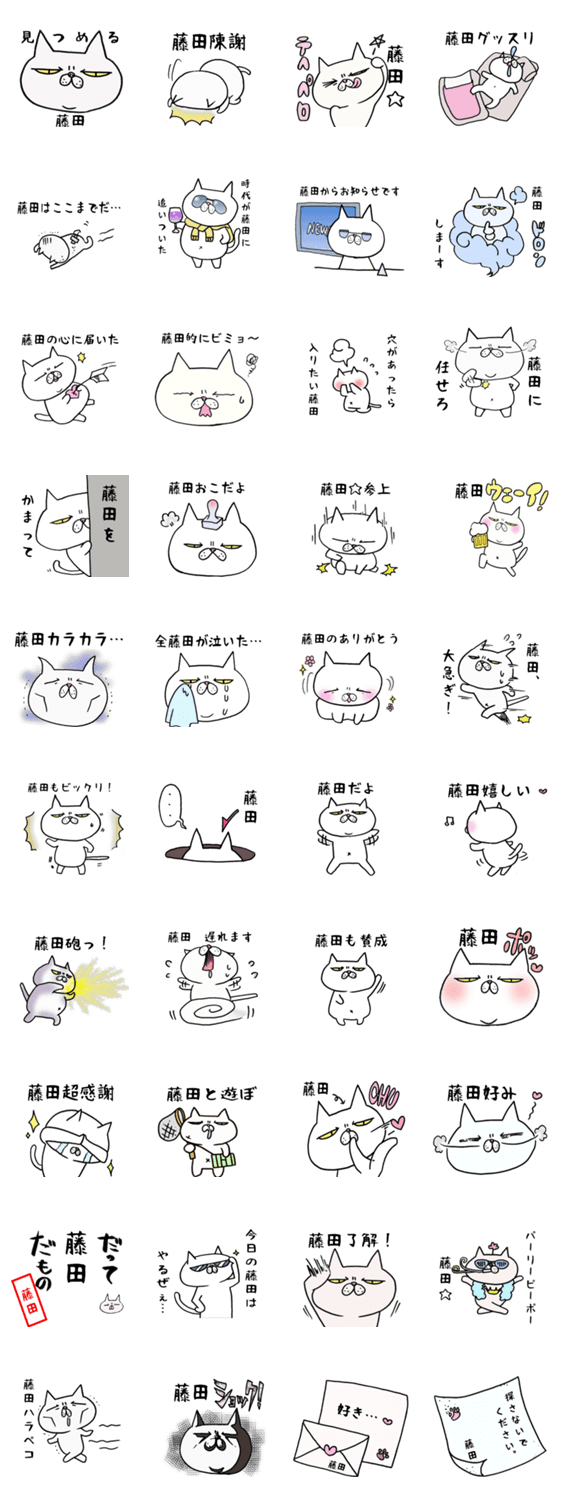 藤田さんの藤田さんによらない藤田さんのためのスタンプです。 どこか憎めないブサ猫の表情をお楽しみください!