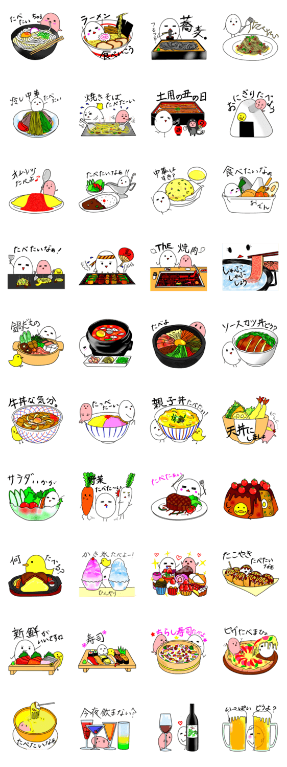 たまご達と美味しいグルメの旅にでかけませんか。スタンプで友達を食事に誘っちゃえ!