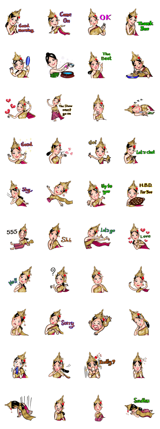 | スタンプ説明 | Miss Samornsri is a lively, cheerful and has a sense of humor. Now, she is in Thai traditional dress and ready to full fill the chat with colourful for you... |