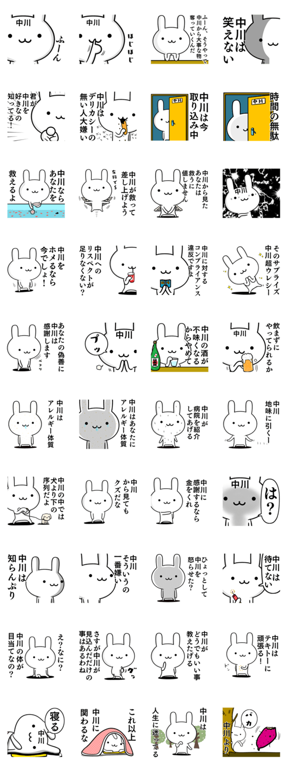 日本全国の苗字の中からなかがわさんの為の無難な?毒舌うさぎスタンプ!便利で面白く,名字が中川さんにずっと使える!家族,友達から愛するナカガワさんへのプレゼントに♡