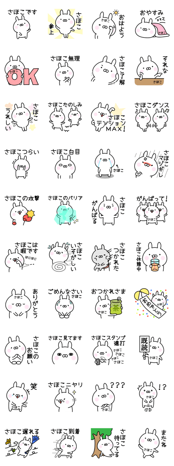 さほこさん、さほこちゃんが使いやすいお名前スタンプです。かわいいうさぎが、さほこさんの気持ちを表してくれています。さほこさんへのプレゼントにも最適です。