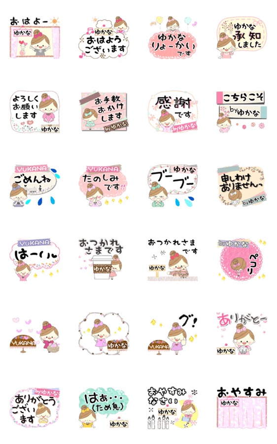 | スタンプ説明 | ゆかな(ユカナ、由香那、由佳菜、有香奈…)さん専用の動くお名前スタンプです。全国のゆかなさんへ使っていただけたら嬉しいです!ゆかなさんへのプレゼントにもどうぞ。 |