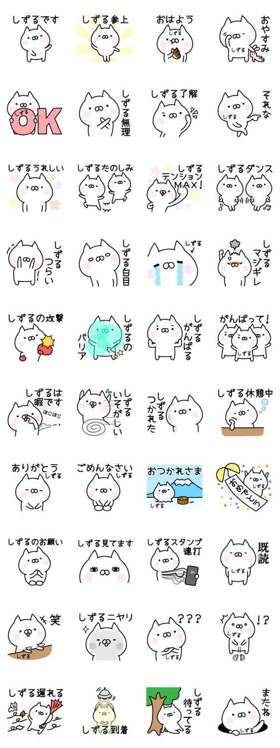 しずるさん、しずるちゃんが使いやすいお名前スタンプです。かわいいねこが、しずるさんの気持ちを表してくれています。しずるさんへのプレゼントにも最適です。