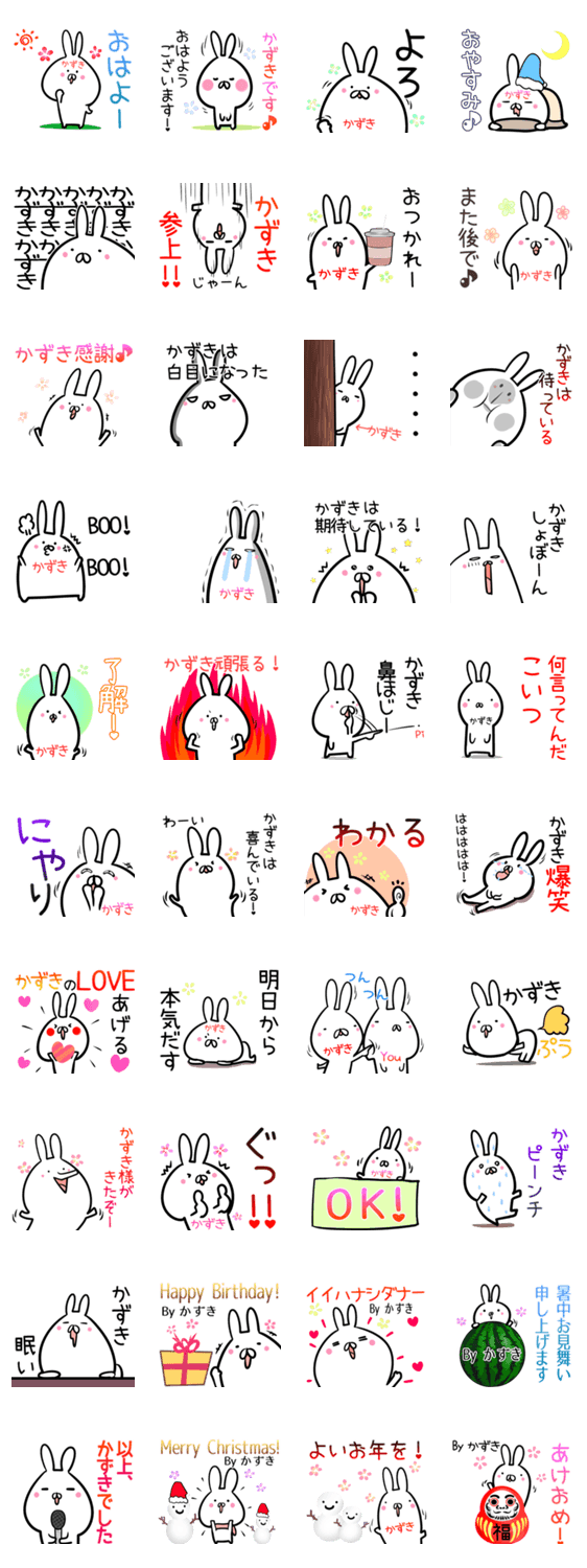 | スタンプ説明 | かずき用の可愛いウサギのゆるい名前(なまえ)/あだ名スタンプ。 一喜 一器 一城 一希 一樹 一機 一毅 一稀 一紀 一綺 一葵 一貴 一起 一輝 一騎 一麒 主基 主輝等の名前用 |