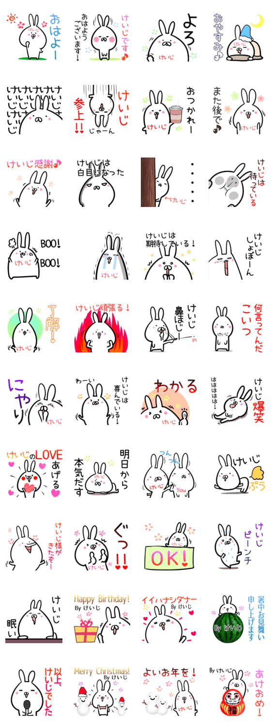 | スタンプ説明 | けいじ用の可愛いウサギのゆるい名前(なまえ)/あだ名スタンプ。 京司 京治 佳二 佳児 佳士 佳慈 刑二 刑児 刑次 刑治 刑路 勁二 勁次 勁治 啓之 啓二 啓児等の名前専用♪ |