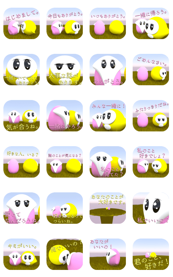 | スタンプ説明 | 出会いからはじまってだんだんに好きになっていく。好きがとまらなくなって、苦しいと思うようになり、覚悟を決めて告白。恋っていうのはそんな物語なときも、あるみたい。 |