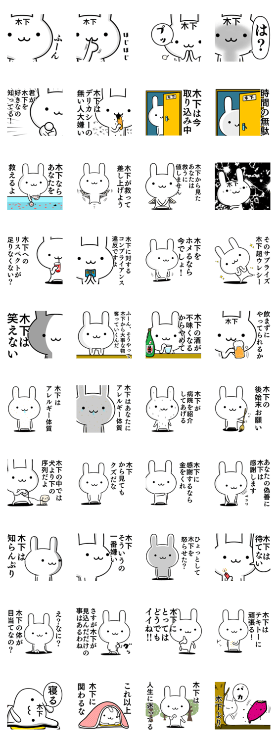 日本全国の苗字の中からきのしたさんの為の無難な?毒舌うさぎスタンプ!便利で面白く,名字が木下さんの方にずっと使える。家族,友達からキノシタさんへのプレゼントに♡