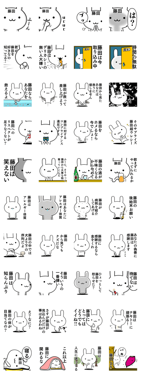 日本全国の苗字の中からふじたさんの為の無難な?毒舌うさぎスタンプ!便利で面白く,名字が藤田さんの方にずっと使える。家族,友達からフジタさんへのプレゼントに♡