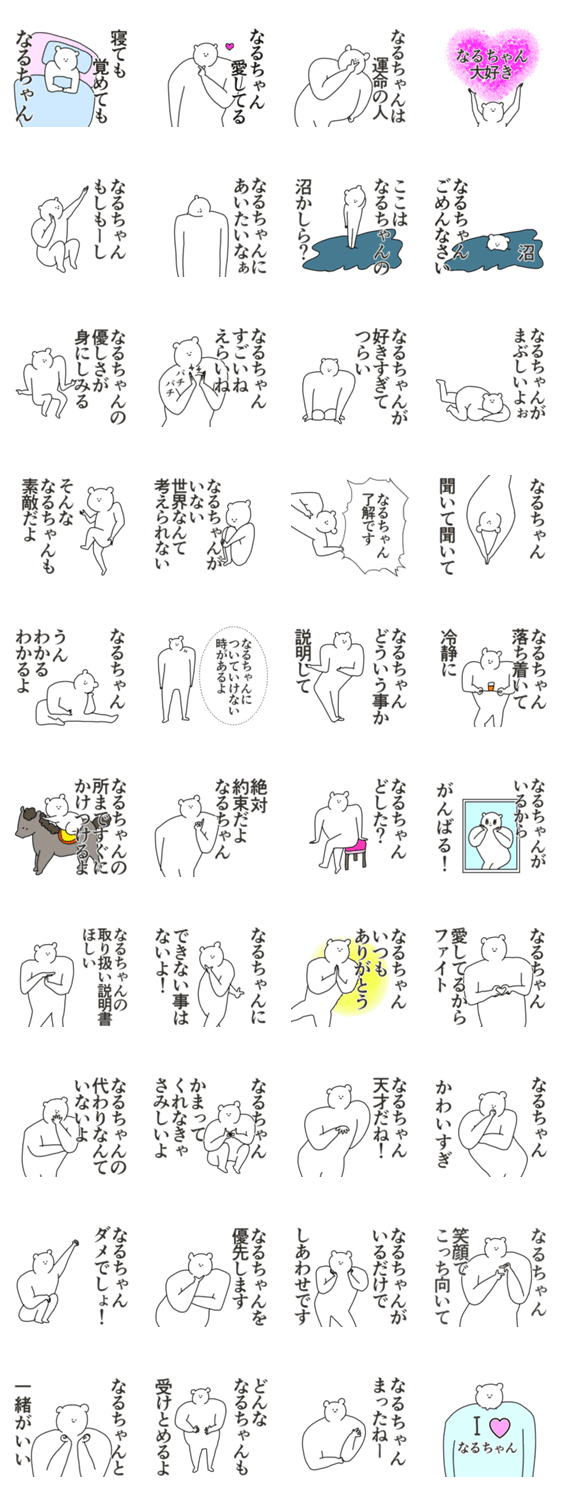 なるちゃん、なるくんに送れる大好きな気持ちと誉め言葉をシュールに伝える。彼氏彼女や友達や家族へ。本人も名前スタンプとして使える。ナル、なるみ、なると、なるこ。