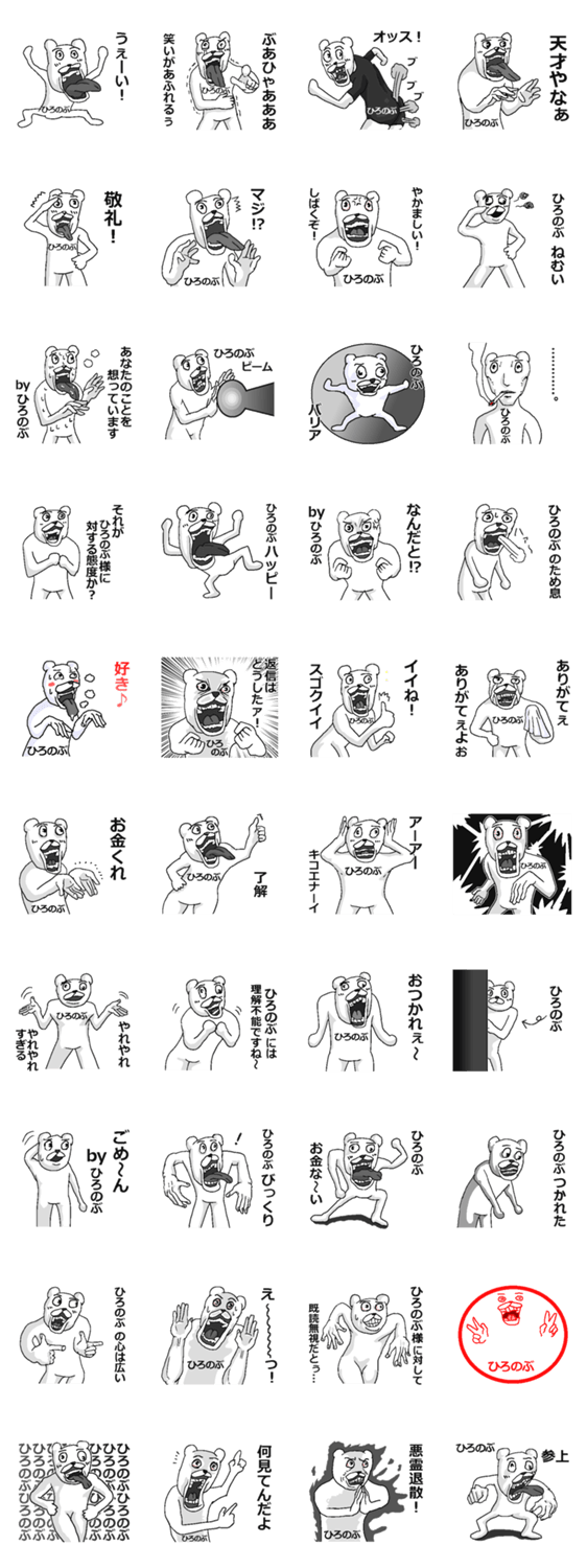 ひろのぶさんが使えるシュールな名前スタンプです。博信/裕信/浩伸/宏伸/博啓/広宣/博宣/博登/博進/大信/寛伸/洋伸/裕伸/紘信/弘信。面白い人気くま。40個。