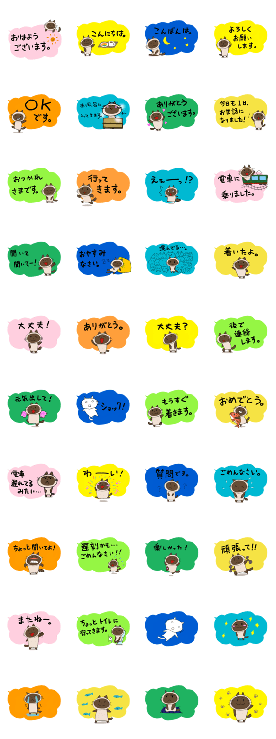 顔のカラーリングがチャームポイント!シャム猫スタンプその3です。今回はお出かけの際に役に立ちそうなスタンプメイン、吹き出し風です。