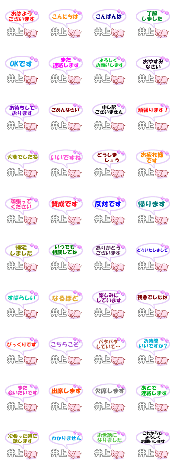 井上「いのうえ」さん専用。おはようございます、了解、出席、欠席、賛成、反対など大人の丁寧な日常会話、連絡用にどうぞ