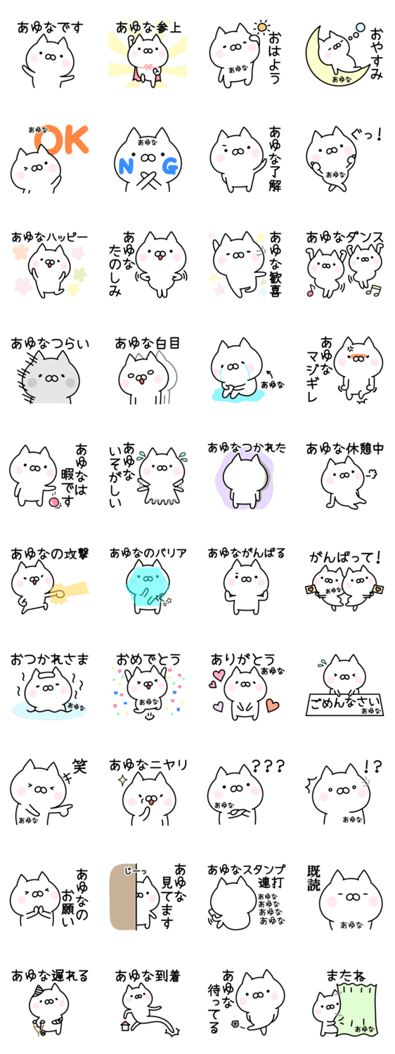 あゆなさん、あゆなちゃんが使いやすいお名前スタンプです。かわいいねこが、あゆなさんの気持ちを表してくれています。あゆなさんへのプレゼントにも最適です。