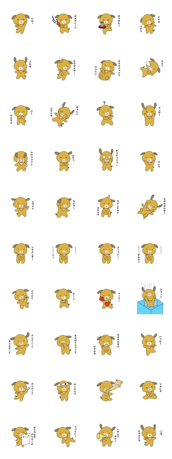 | スタンプ説明 | He is a cheerful dog named Pochi.He always wears his favorite orange scarf. |