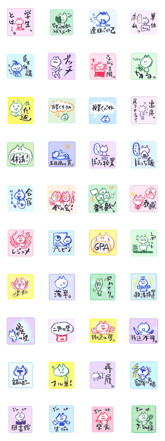 「人生の夏休み」とも呼ばれる大学生活ですが、そこには恐ろしくくだらない戦いがあふれています。そんな単位や孤独と戦う大学生の日々をスタンプにしました。