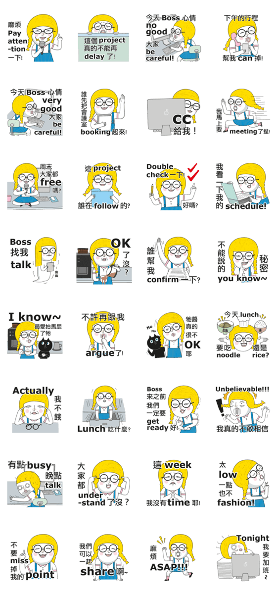 | スタンプ説明 | Hello everyone, I am lady Peach. Welcome to my English class LOL! Let's learn some general office basics. |