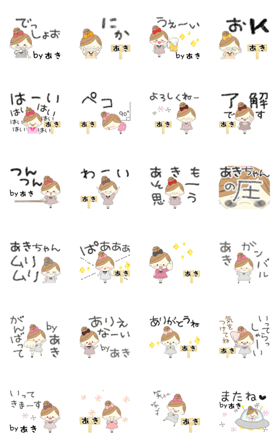 | スタンプ説明 | 「あき」さん専用の動くお名前スタンプです。お団子ヘアのキャラクター”マフィ”がメッセージを送ります。全国のアキさんへ!あきさんへのプレゼントにもどうぞ! |
