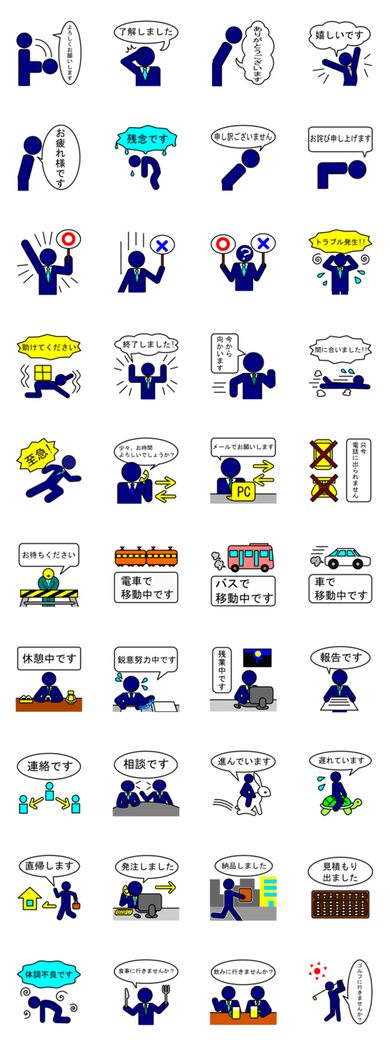 | スタンプ説明 | 街で見かけるあの人はビジネスマンだった!シンプルなスタンプが好きな人、仕事に使いたいけどかわいいのはちょっと…そんなあなた!こんなのどうですか? |