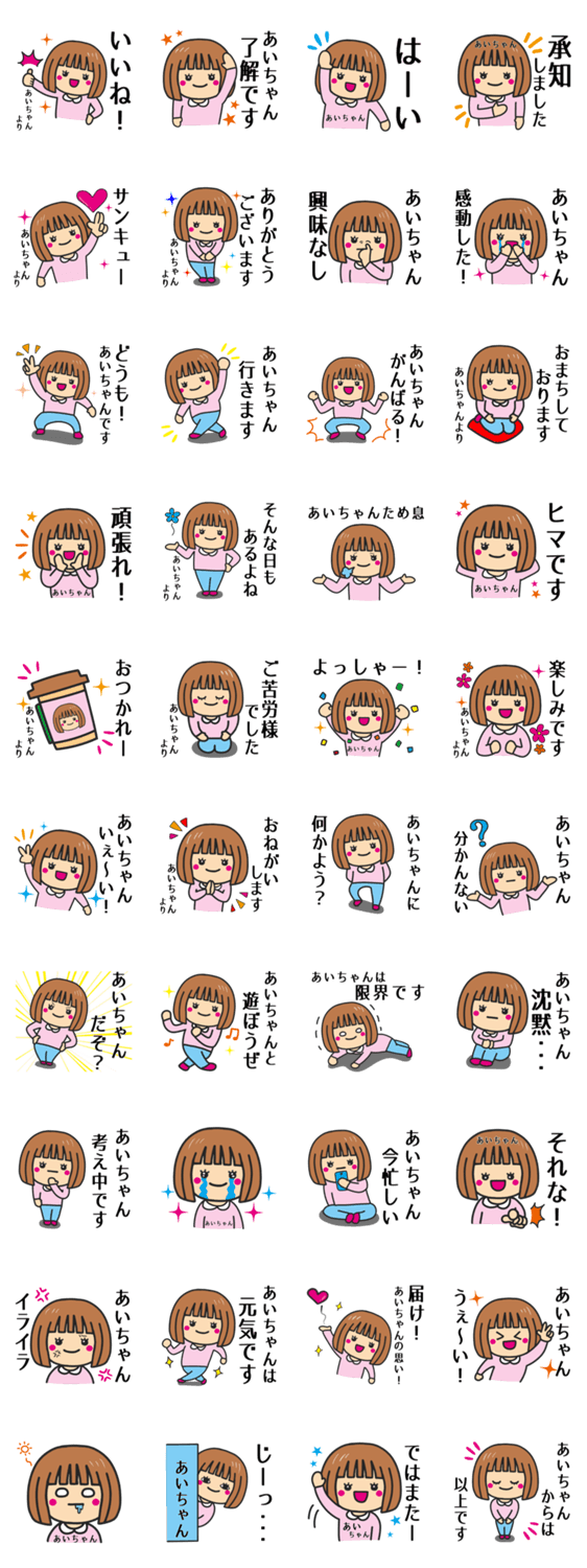 あいちゃんが使える、女の子の名前スタンプです。日常会話で毎日使える基本セットです。愛/アイ/藍/亜衣/愛生/亜依/愛衣/逢など。