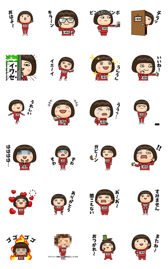 いわせ(岩瀬,岩橋,岩瀨)が使うアニメーションスタンプ。ジャージになまえが入っているので、名前スタンプでありながら自然な言葉で会話ができる優れモノ。干物女♪