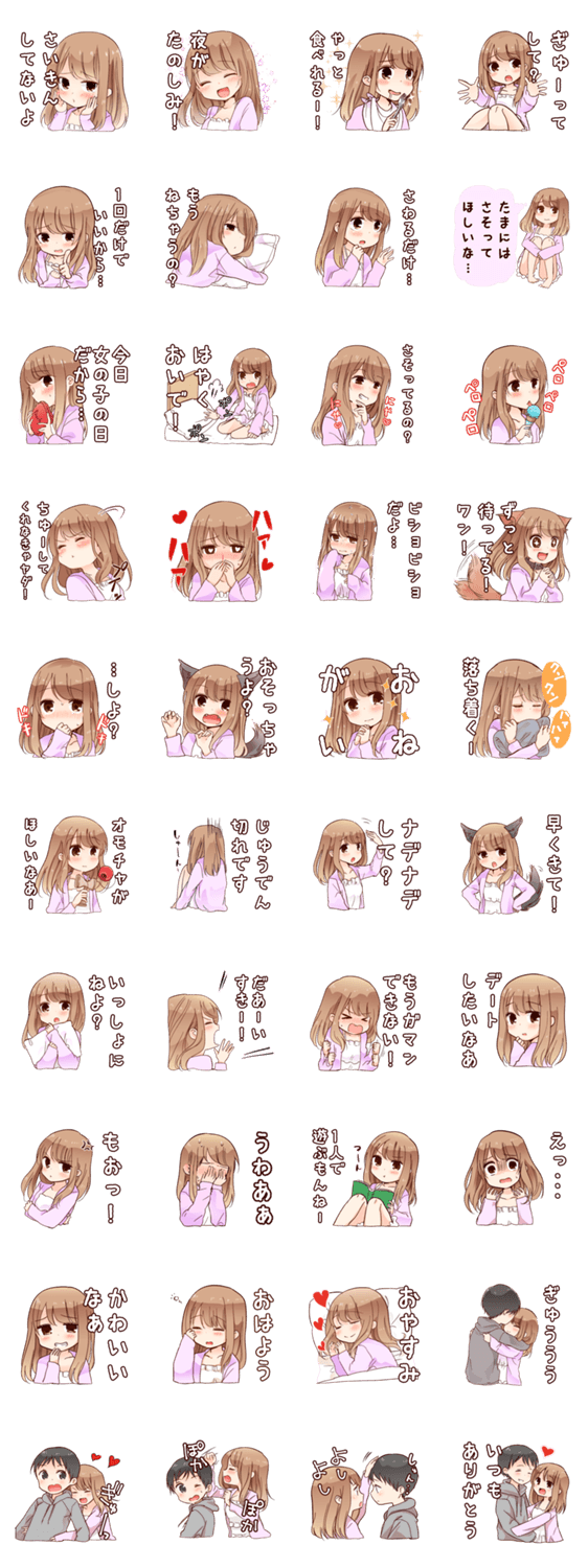 恋人や気になる彼に素直に甘えられる彼女スタンプです。