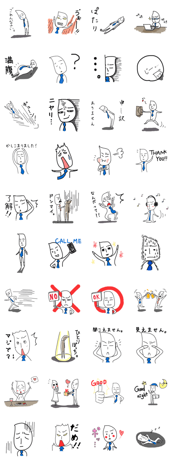 しかめっ面でひょろっと細い「サラリーマンひょろ男」。真面目でネガティブな彼ですが感情が爆発することも。微妙な感情を伝えたい時にどうぞ。