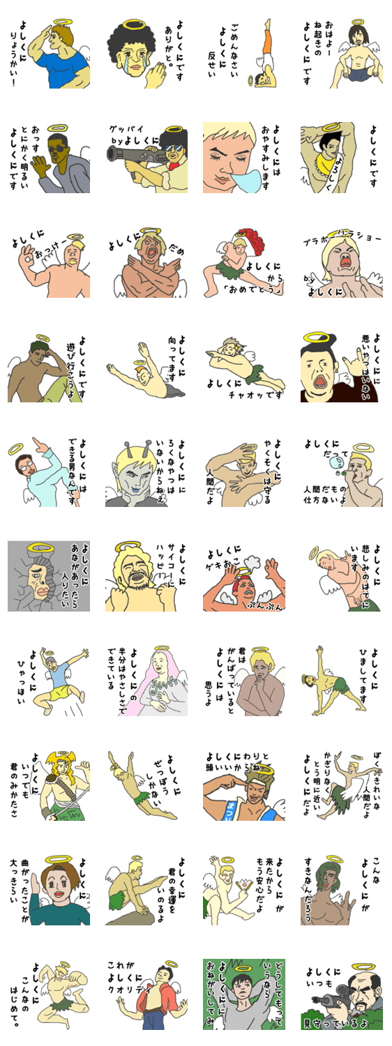 | スタンプ説明 | 日常フレーズから少しマニアックなフレーズまで、ちょいイラ天使系のよしくに専用名前入りスタンプです。ヨシクニ/義邦/義国/良邦/嘉邦/芳邦/恭邦などのなまえの方に |
