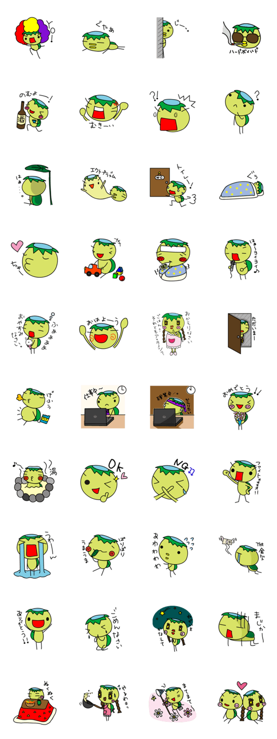 | スタンプ説明 | 絵をかくのが苦手な、なま部のぶちょーが描く脱力系かっぱです。 |